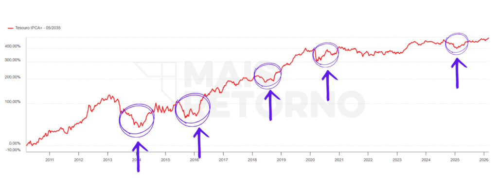 Ele só é arriscado para os impacientes. O risco vem da “marcação a mercado”. O preço desse título sobe e desce todos os dias. Se você precisar vender antes da data de vencimento num momento de crise, pode resgatar um valor menor do que investiu. Se levar até o final, o risco de perda é zero.